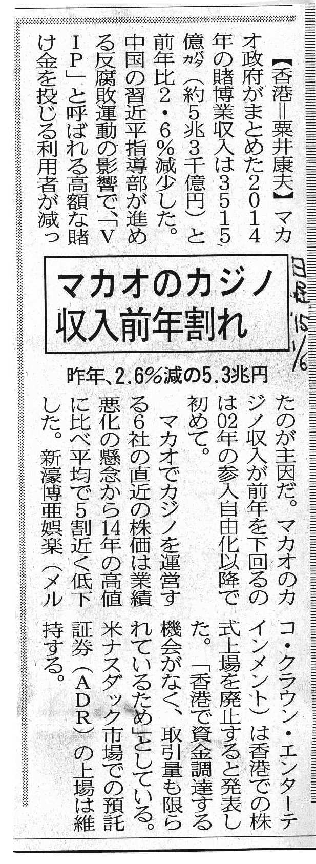 日経・1月6日。「マカオのカジノ収入前年割れ」